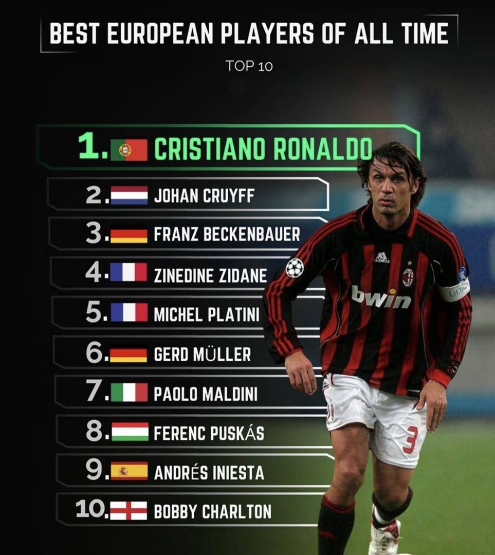 马尔蒂尼是前十中唯一的纯后卫,其5座欧冠冠军和意甲七次夺冠的稳定性无可挑剔。